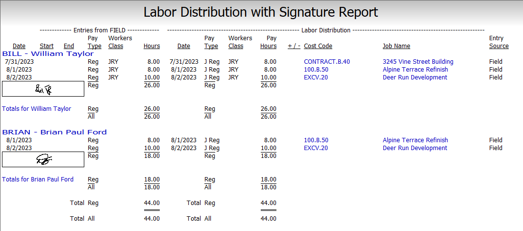 This report is a temporary report, and information will be cleared when Payroll is posted (as do other Labor Distribution Reports). Deltek recommends saving as a PDF. The Creator and Approver of ComputerEase Field entries will also be displayed on the report.