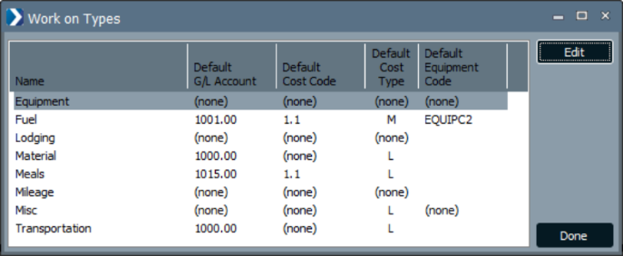 Expense Types are predefined categories that have the option for default G/L Accounts, cost codes, and job cost type, Equipment, and Equipment Cost Type. While not required, using defaults can ensure accuracy and streamline the editing process for classifying Expense entries from ComputerEase Field.