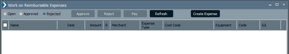 If an expense was submitted as a Personal Expense through ComputerEase Field, the entry will flow into Accounts Payable > Expense Management > Work on Reimbursable Expenses. Selecting the dials in the header will display entries by status: