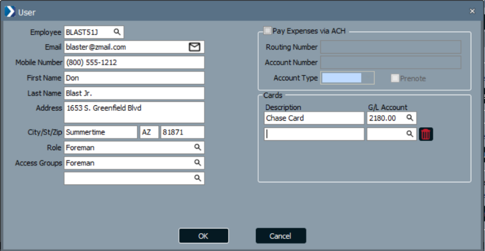 When ComputerEase Field Expense entries are created, the user must either choose Personal Expense or select a company Card based on the options defined in User Maintenance.