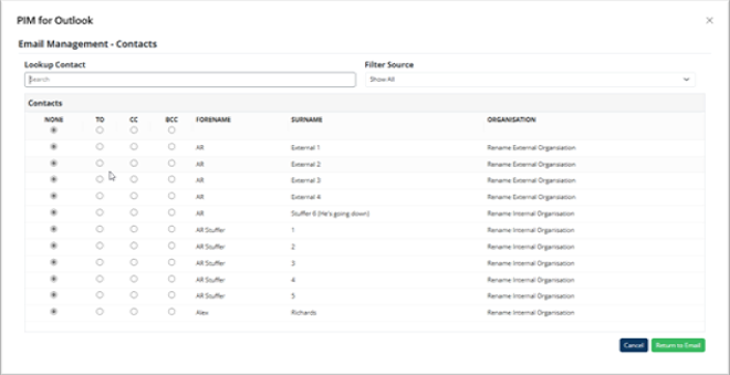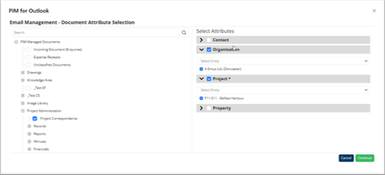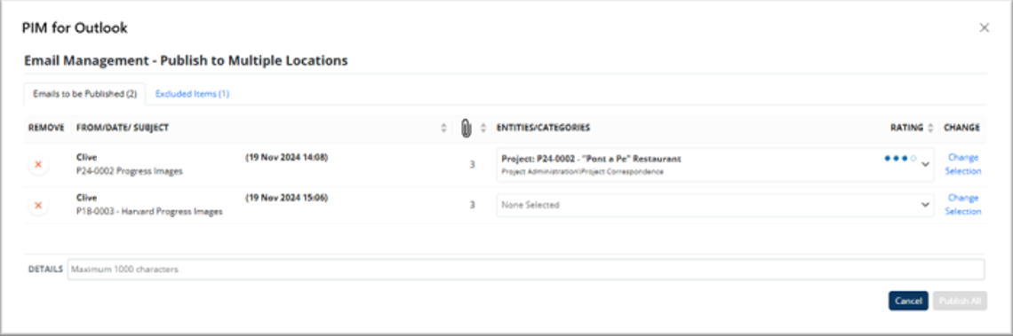 - Email subject line: if the subject contains a PIM entity code, matching locations are suggested.