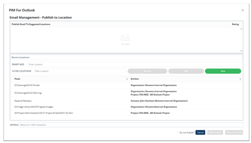 - Email chain history: if earlier messages in the thread were published to PIM, those locations are suggested again.